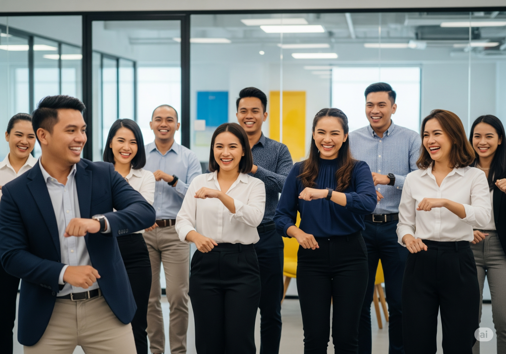 Ini bukan sekadar tarian biasa! Ini adalah ajakan berani untuk membuka diri dalam kerentanan menginternalisasikan servant leadership. Secara bergantian, setiap peserta maju, memimpin sebuah gerakan unik, gerakan yang lahir murni dari spontanitas, menginspirasi dan ‘memprovokasi’ peserta lain untuk meniru. Awalnya? Ada sedikit keraguan, senyum malu-malu, bahkan tawa canggung yang pecah. Tapi perlahan, energi pun mulai membuncah! Saya melihat para profesional yang biasanya serius dalam presentasi penjualan, kini dengan riang gembira mencoba gerakan-gerakan spontan, membuat semua orang bersorak dan tertawa lepas tanpa beban. Ini momen krusial! Dalam setiap gerakan yang mereka ciptakan, tersimpan keberanian untuk terekspos untuk menjadi “tidak sempurna” secara visual, dan untuk membiarkan diri mereka dilihat apa adanya.